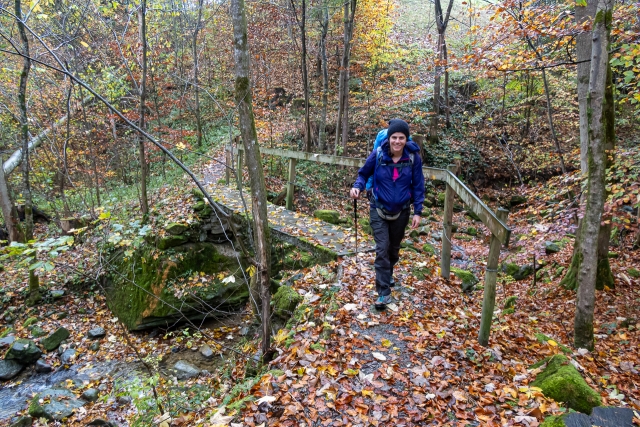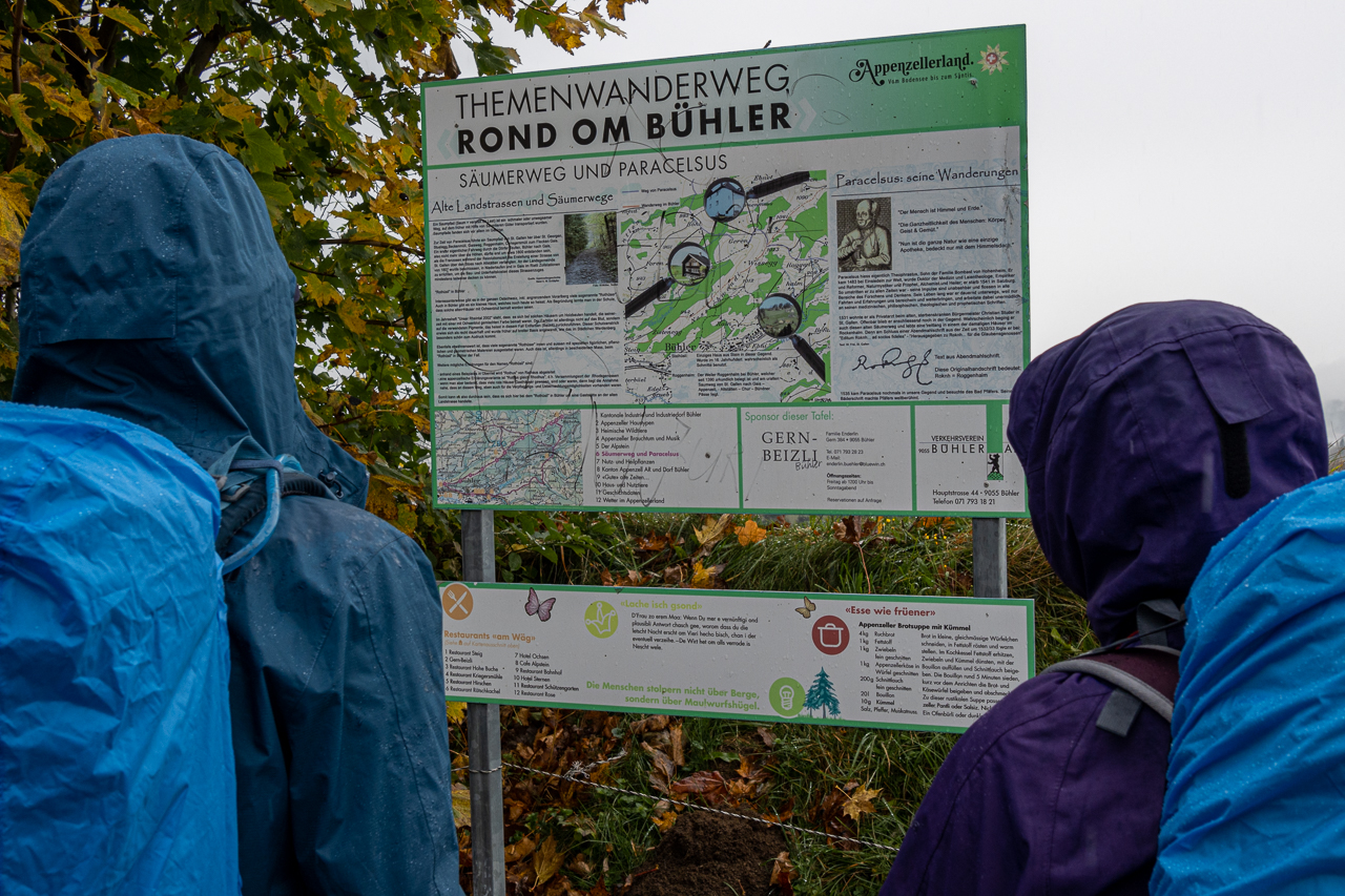 Gut eingepackt stehen wir parat für die heutige TourDie ersten Minuten in Speicher brauchts noch den RegenschirmIn einer kleinen Schlucht zwischen Speicher und TrogenIn Trogen blicken wir zurück nach SpeicherAm Bahnhof Trogen waren wir gestern (ungeplant) auchDer Blick in Richtung Osten nach Wald AR und RehetobelDie „Drei“ hat uns wiederVorbei am Kinderdorf Pestalozzi in TrogenOb es für die Bauten Mengenrabatt gab?Abkürzung tönt immer verlockend, hier allerdings entspricht das auch der geplanten TourDie Fotografin in ihrem ElementAuf dem höchsten Punkt von heute, die „Hohe Buche“ auf 1130 müMEs geht weiter in Richtung BühlerDer Themenwanderweg stösst auf InteresseIch glaube die beiden machen sich über mich lustigIm Abstieg nach BühlerAm Bahnhof von Bühler gönnen wir uns einen kurzen Kaffeehalt und……stärken uns aus meinem Rucksack mit dem vielfältigen Blevita-Angebot