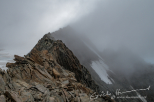 ...auf dem felsigen Gipfelgrat unterwegs, wobei sich der Gipfel selbst noch verhüllt zeigt