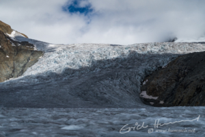 Die Bewölkung nimmt wieder zu, weswegen sich der Abbruch des Ewigschneefälds im Licht/Schatten-Spiel zeigt